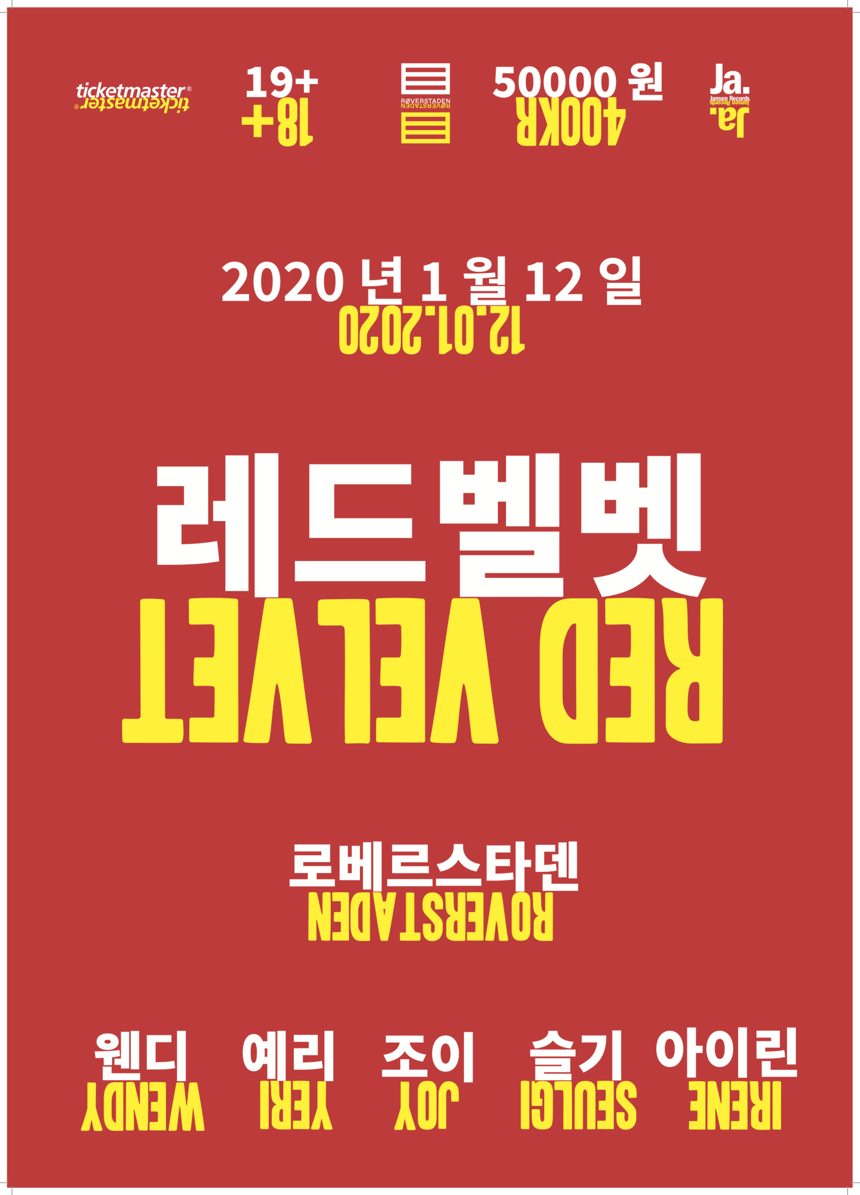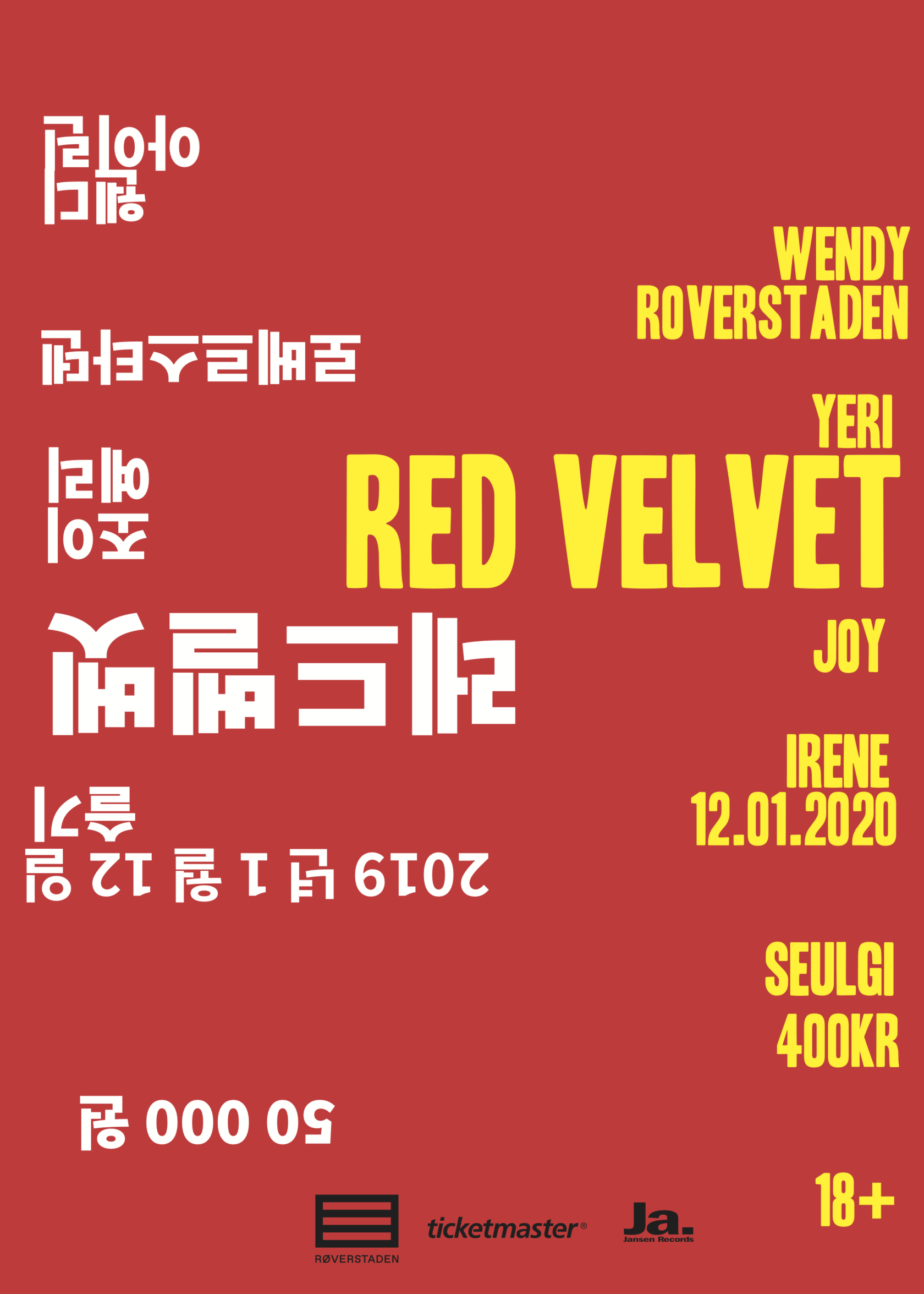 Artist : Red Velvet, a South Korean girl group Program used: Adobe Indesign Text : Same text, only in Korean (hangul). -I chose to change the age limit in Korean to 19+ since that is the age of Majority. -I also converted the ticket from Norwegian Krone to South Korean Won.