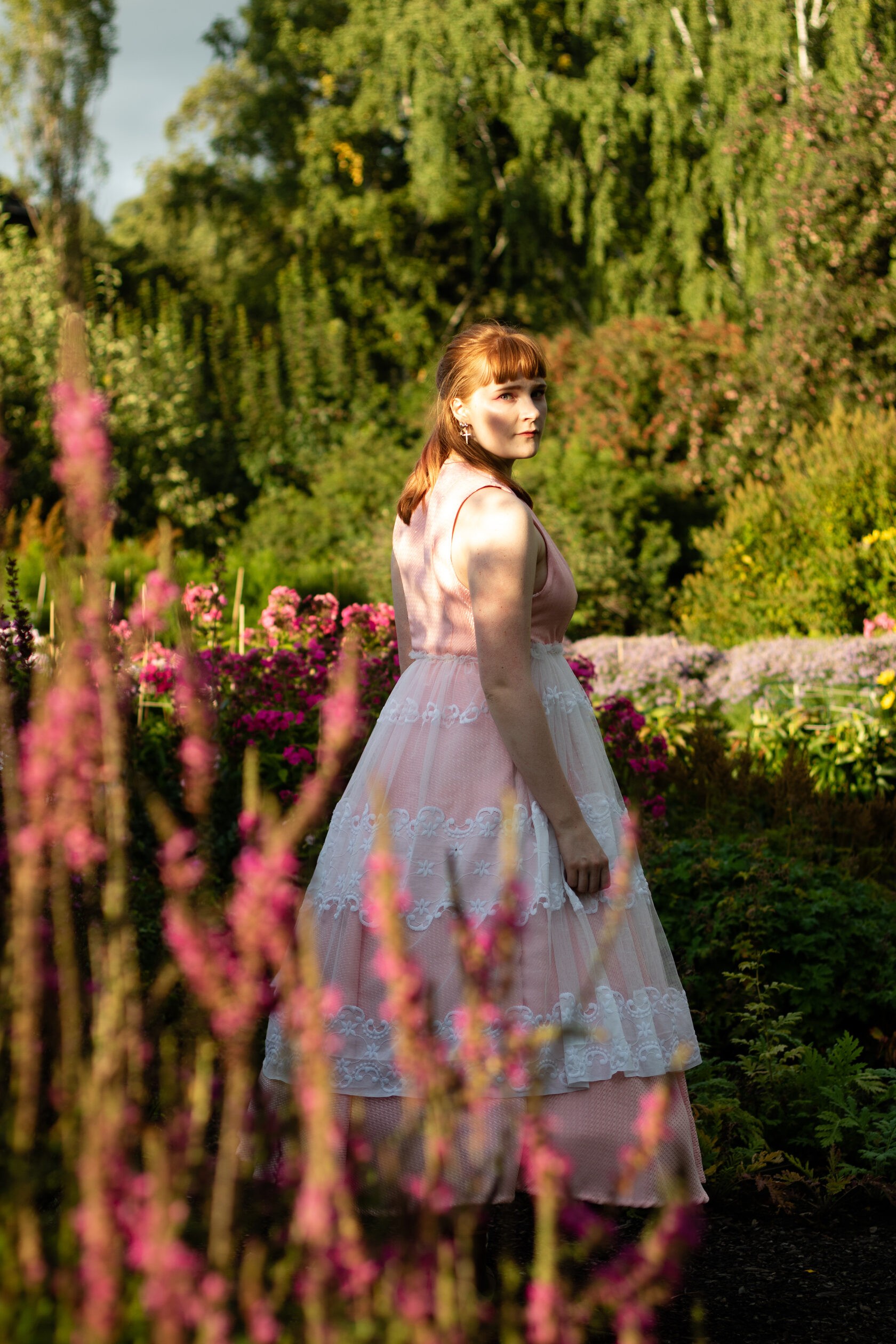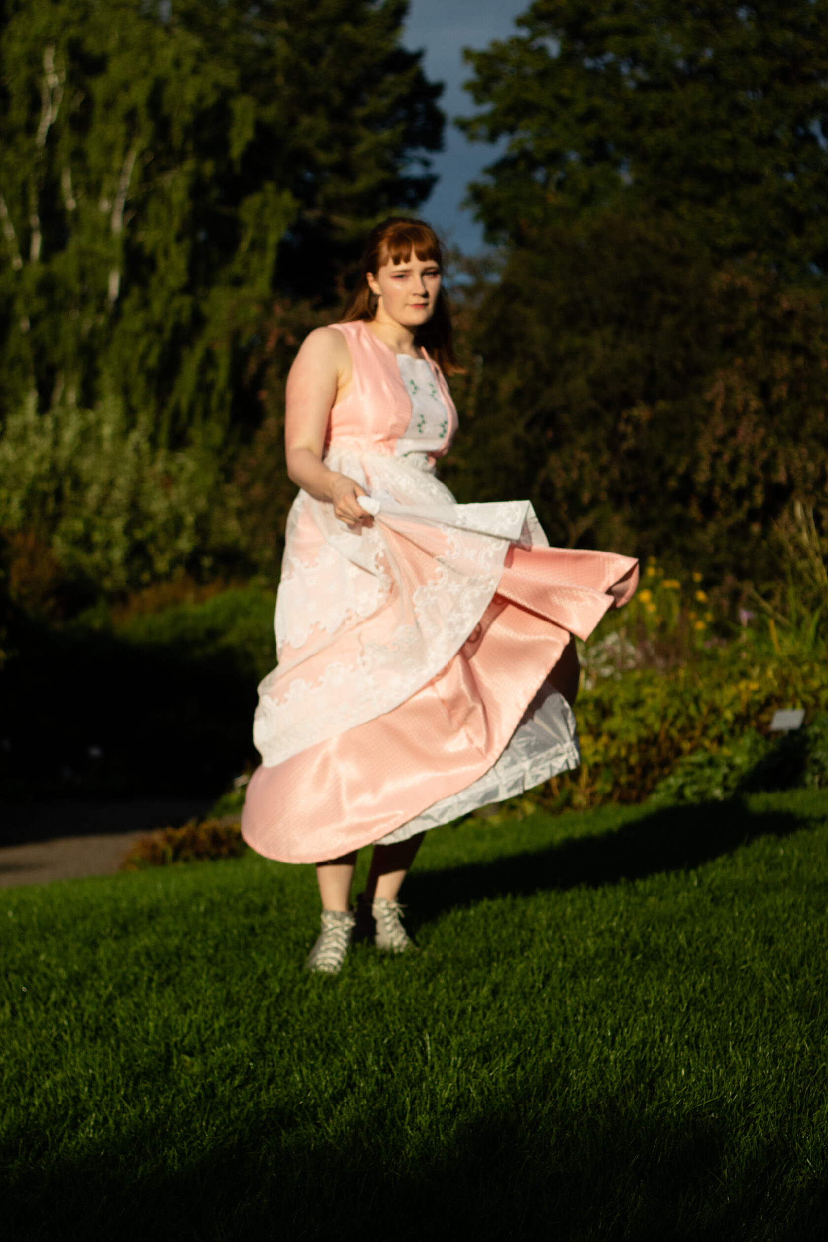 A dress in heavy material that is inspired by princesses, but also a some fun with the lace