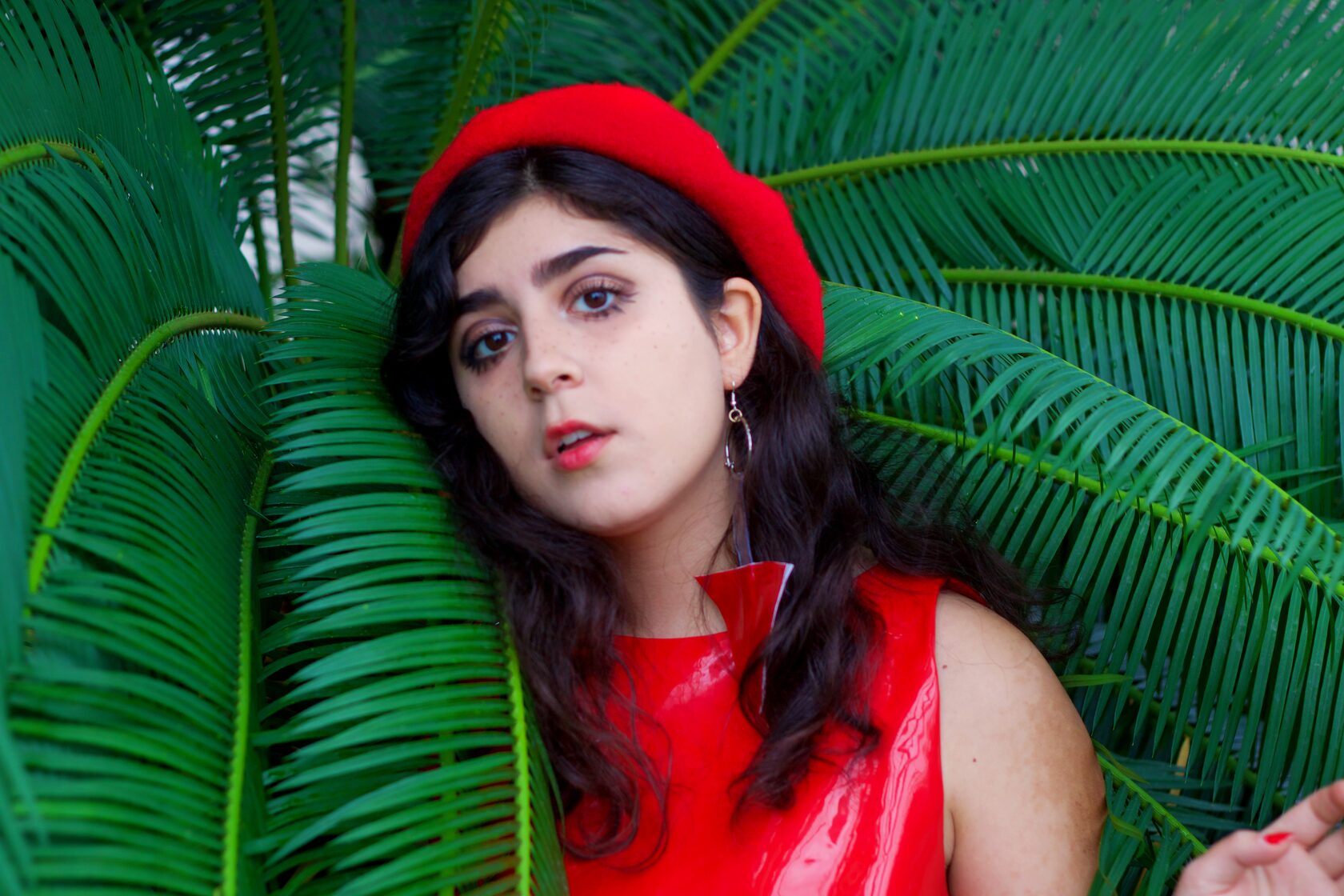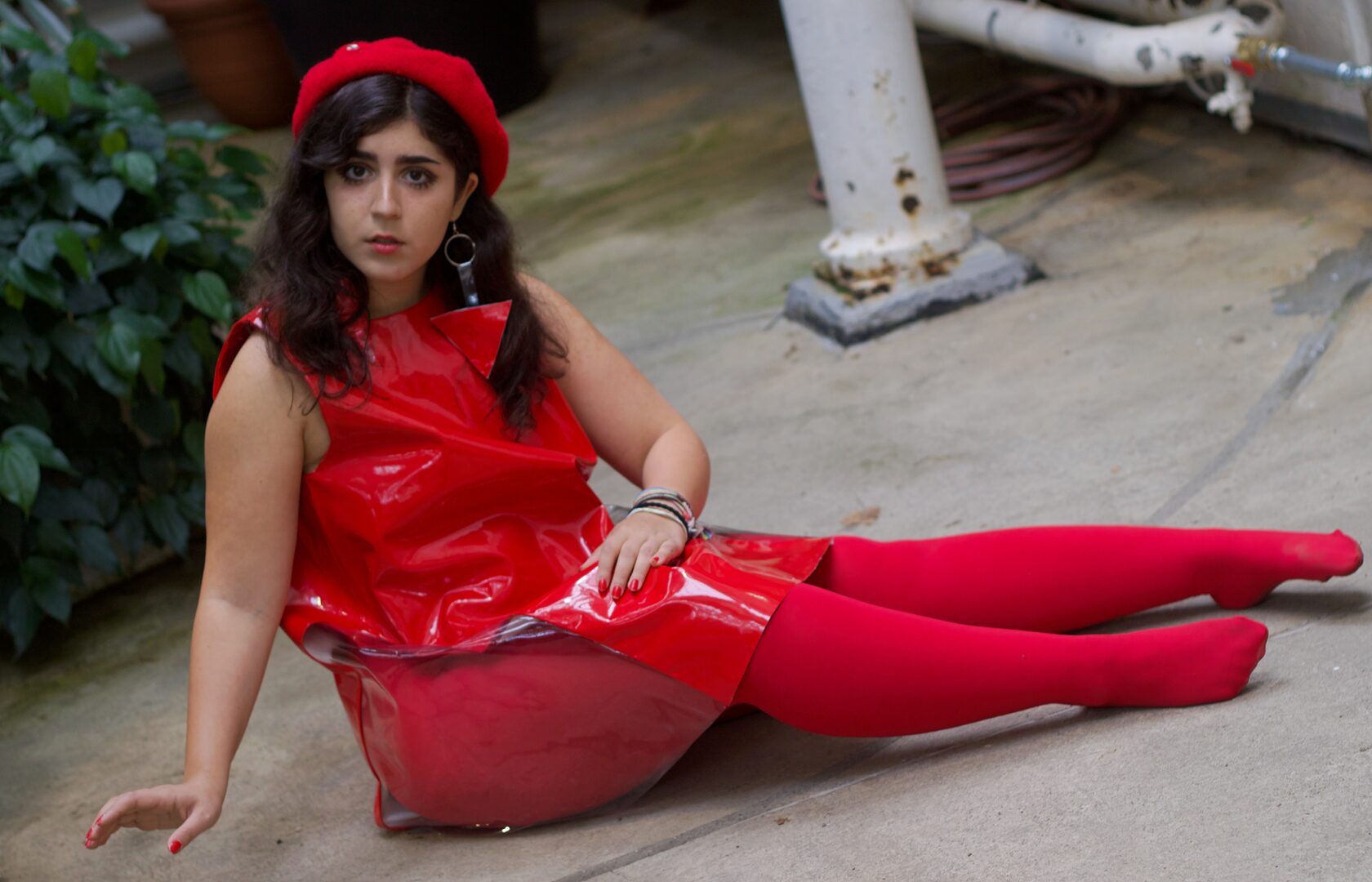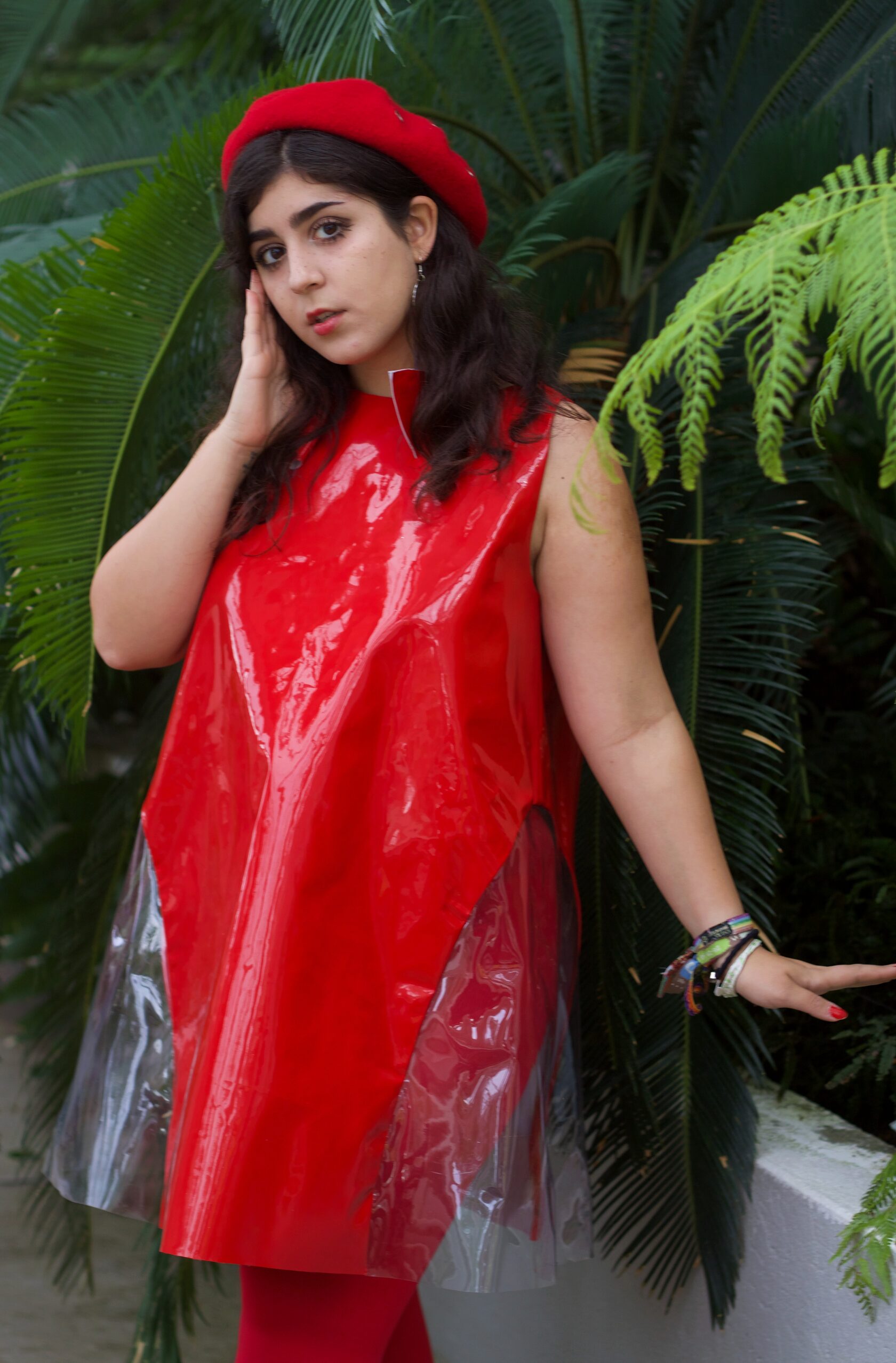Self constructed dress pattern using red and see- through PVC, mostly used for tablecloth